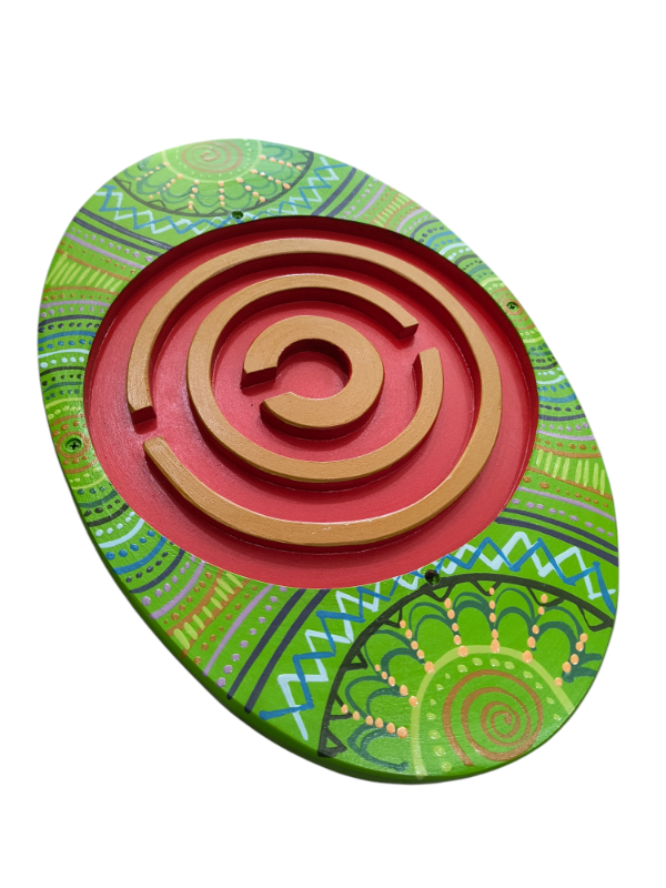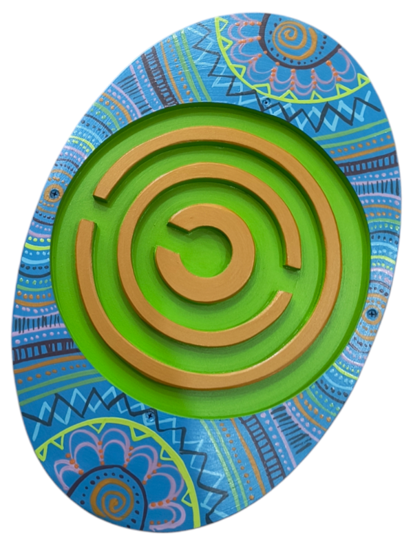 Sobre la tabla, hay que lograr balancear el peso del cuerpo, de modo tal que la canica logre realizar el laberinto desde el exterior al interior del mismo.